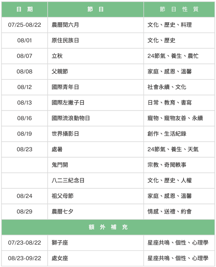 統整出節日之後,我們一起思考:我的品牌、我的創作帳號,可以怎麼切入運用呢?