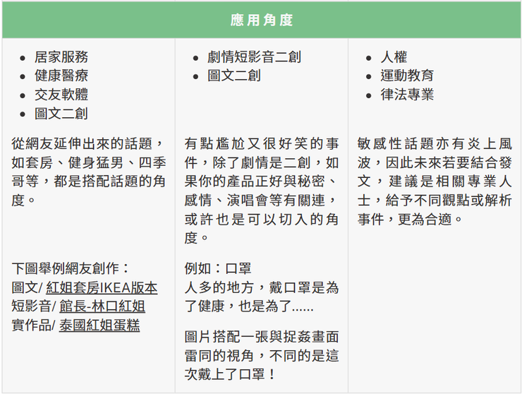 - 梗不在老,有共鳴最好!針對熱門短影音,或許也不一定是跳舞的方式,單純以搭配熱門音樂的方進,配合節奏轉換畫面,也是不錯的方式。