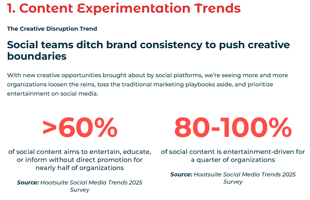 - 根據hootsuite2025社群趨勢報告,隨著社群平台帶來的多元曝光機會與創意性質,60%以上的團隊嘗試突破創意界限,提升在社群上創意參與。