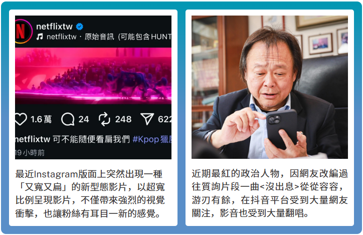 - 看膩了9:16規則的短影音,因此當IG扁長型短影音一出,即獲得大量轉傳及討論,社群貼文給人一種耳目一新的感覺。