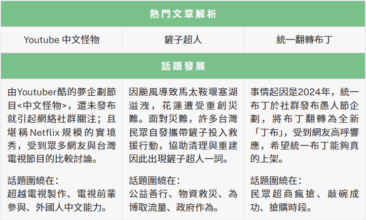 花蓮馬太鞍溪上游堰塞湖於9月23日發生溢流,重創光復鄉,從災害發生的檢討、鏟子超人的支援,事件持續受到社會關注,以事件關心、友善支持角度是對品牌較安全的切入點。